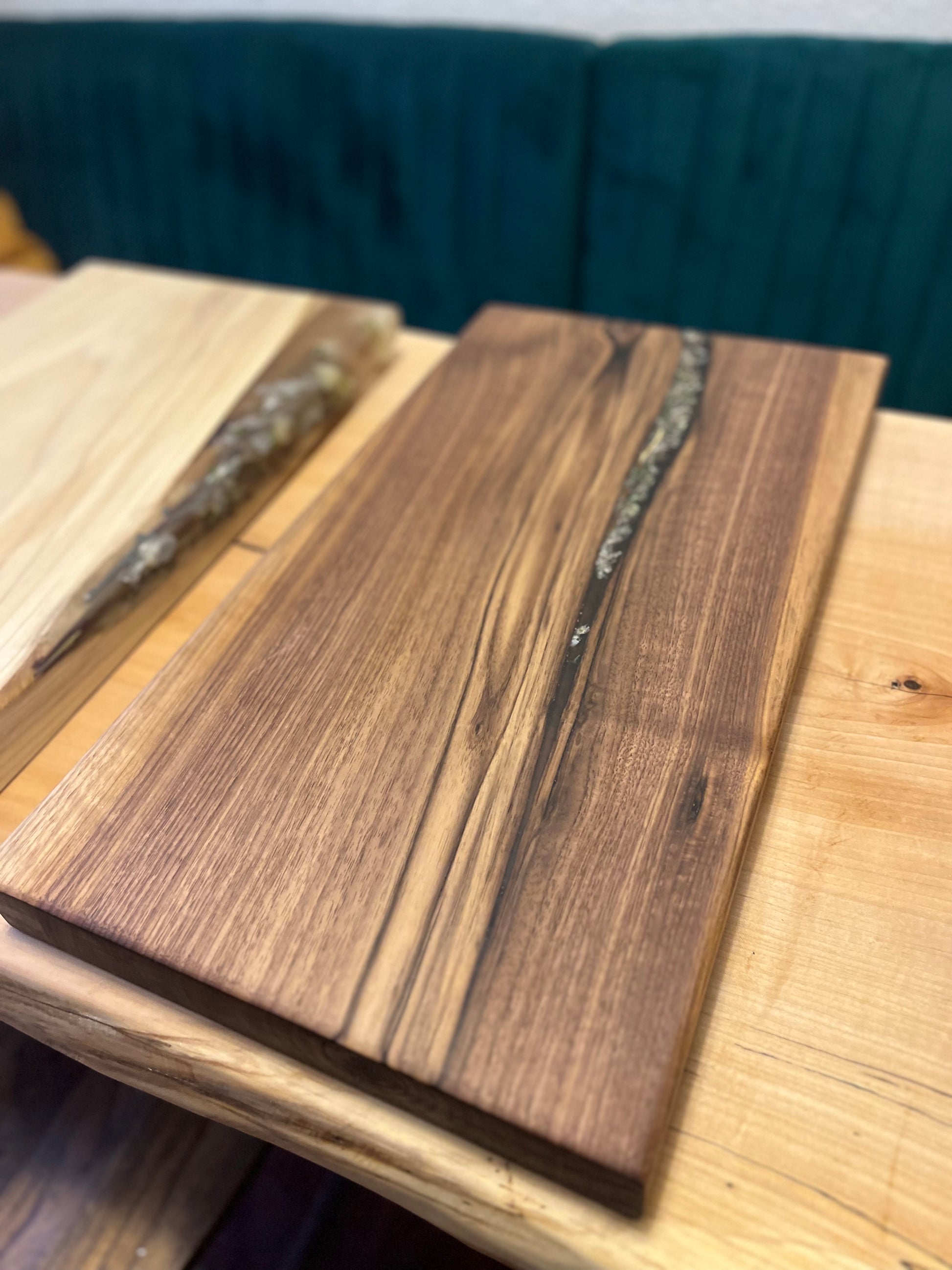 Serving Tray / Charcuterie Board. Real local flowers and herbs suspended in Liquid Glass resin fill the crack of this beautiful, thick walnut board.